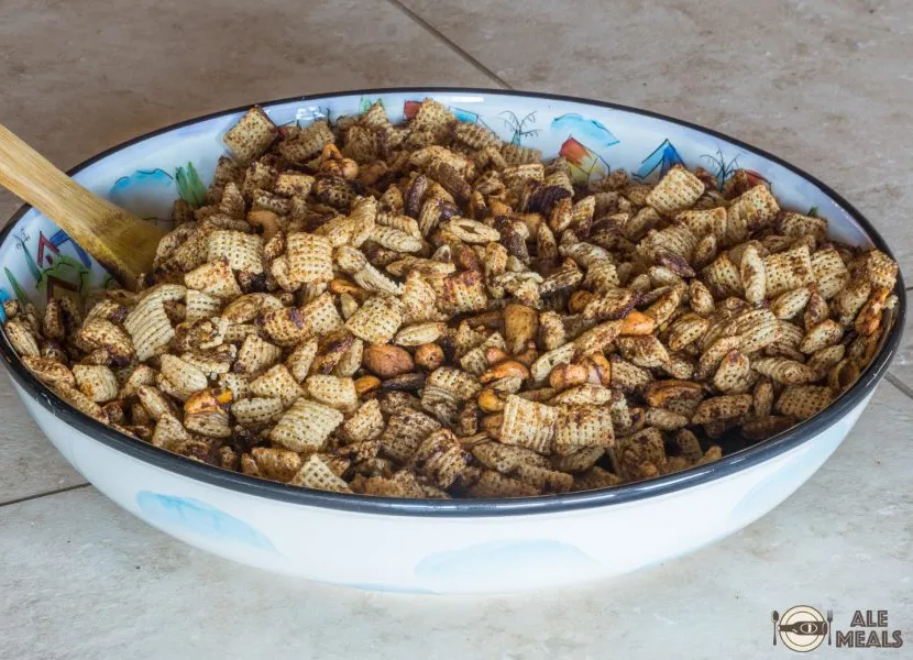 We zitten deze keer nog steeds in de Sriracha-trein met een variant op de klasse Chex Mix - een Sriracha Stout Chex Mix. De stout wordt gereduceerd tot dikke siroop en boter en aan die siroop wordt Sriracha toegevoegd. Dit gemengd met cashewnoten, Thaise groene curry en de Rice Chex.